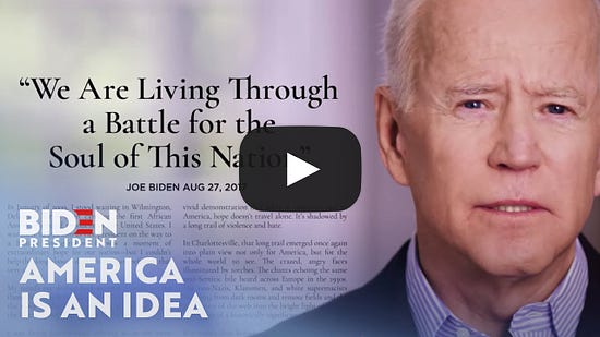 The video switches to upbeat music and faster energy as Biden says, “I know America. I know we’re good and decent people. I know we’re still a country that believes in honesty and respect, and treating each other with dignity. That we’re a nation where we give hate no safe harbor. We believe that everyone is equal, that everyone should be given a fair shot to succeed in this country.”